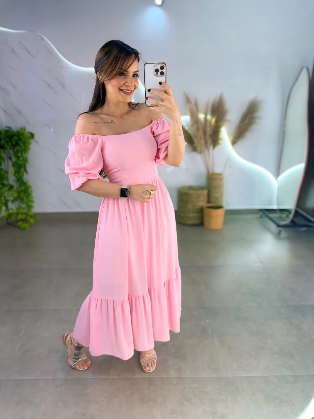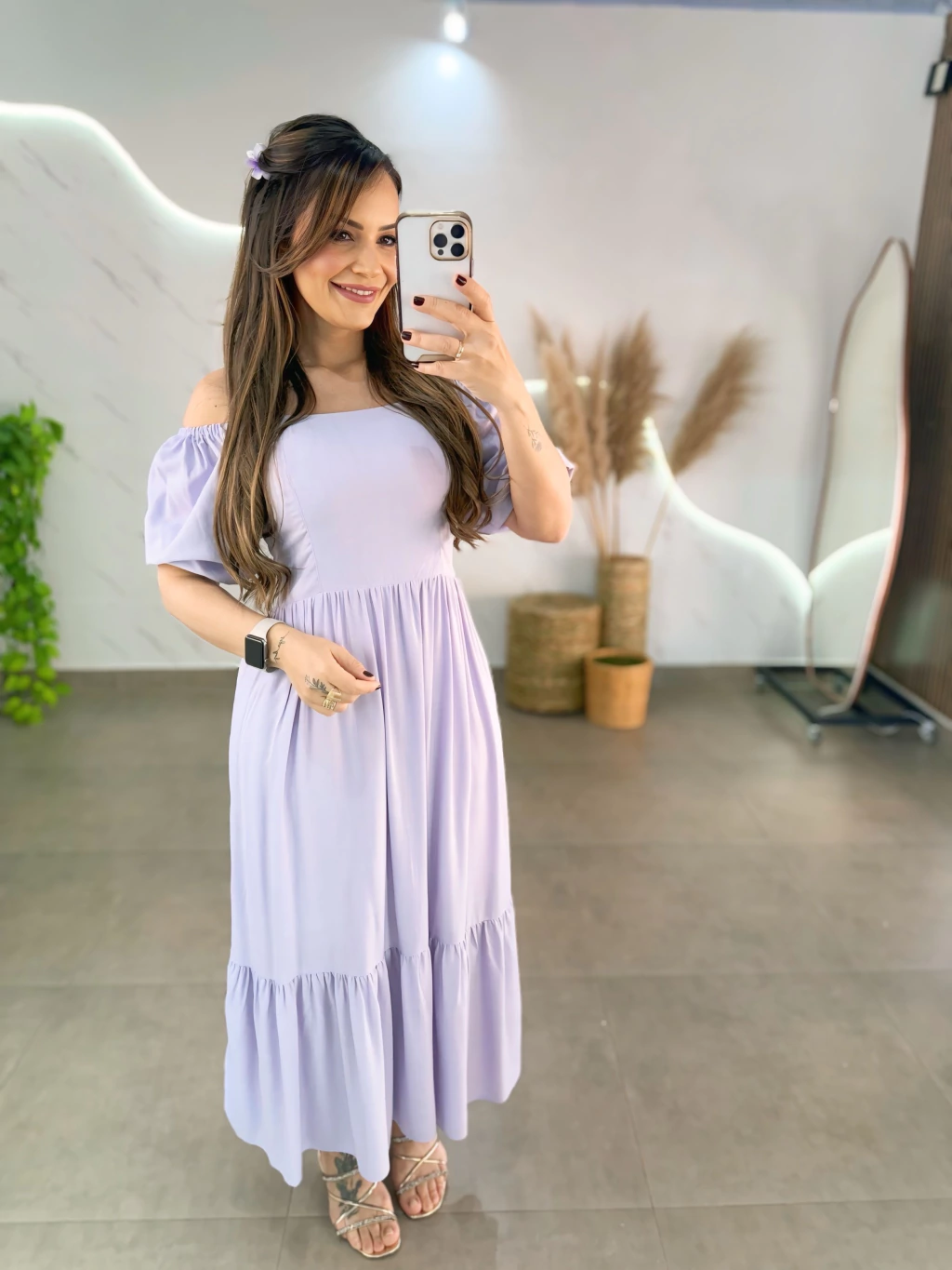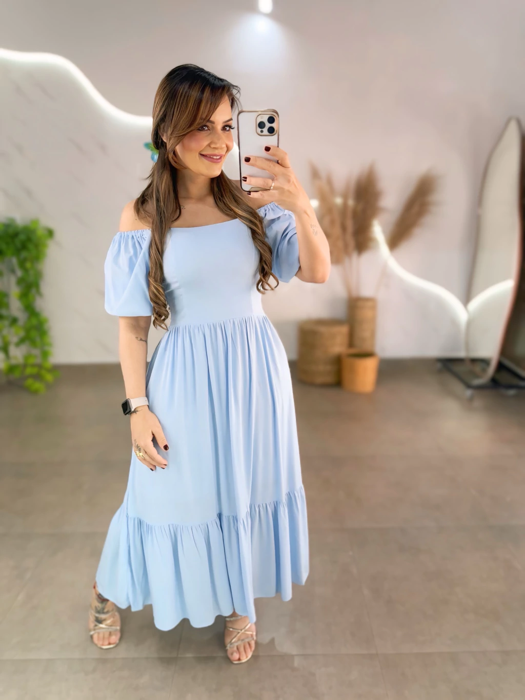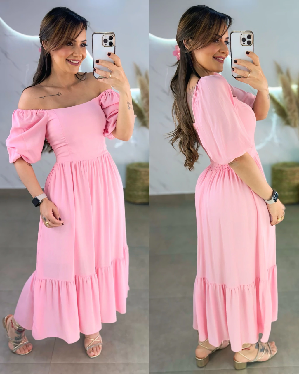 Este vestido mídi em tecido viscolinho forrado é perfeito para quem busca estilo e praticidade. Com manguinhas bufantes delicadas e lastex nas costas, ele veste do 36 ao 44 com ajuste confortável. O diferencial 2 em 1 permite usar ombro a ombro ou tradicional, adaptando-se ao seu mood.