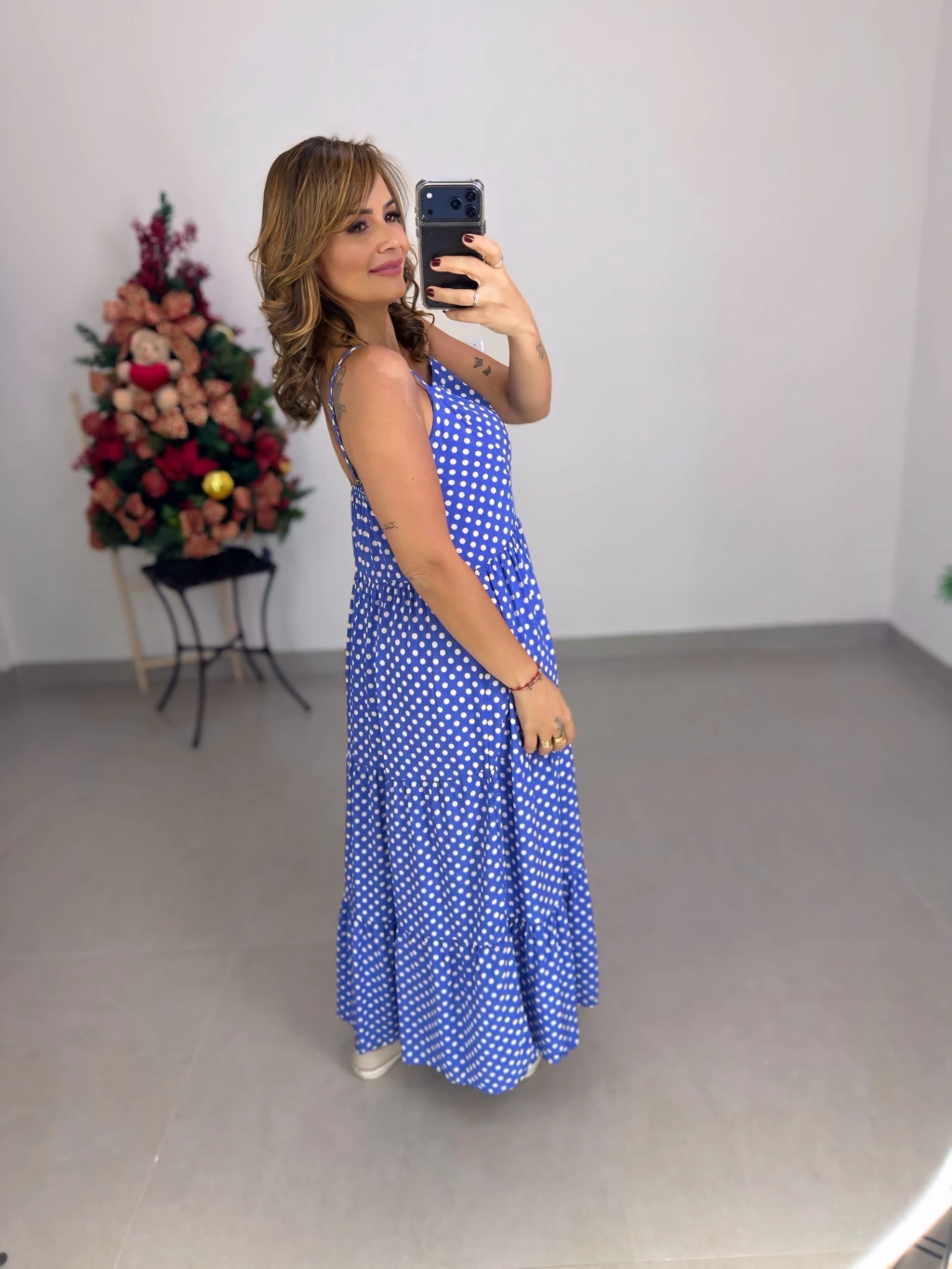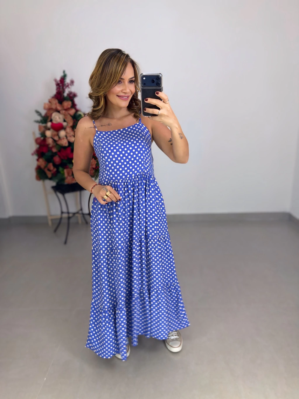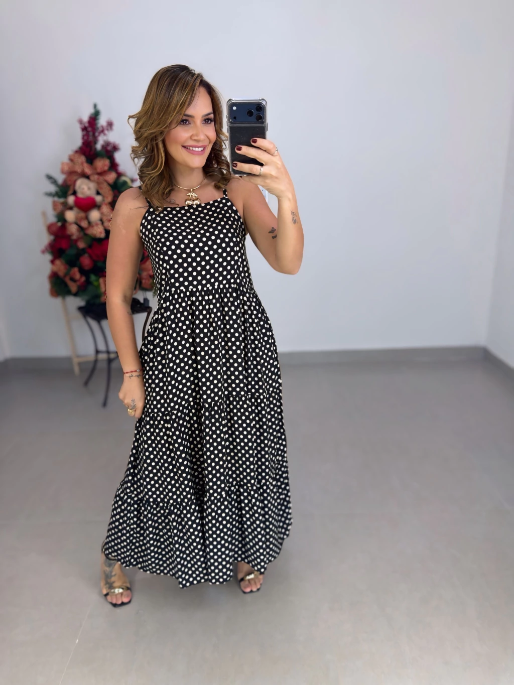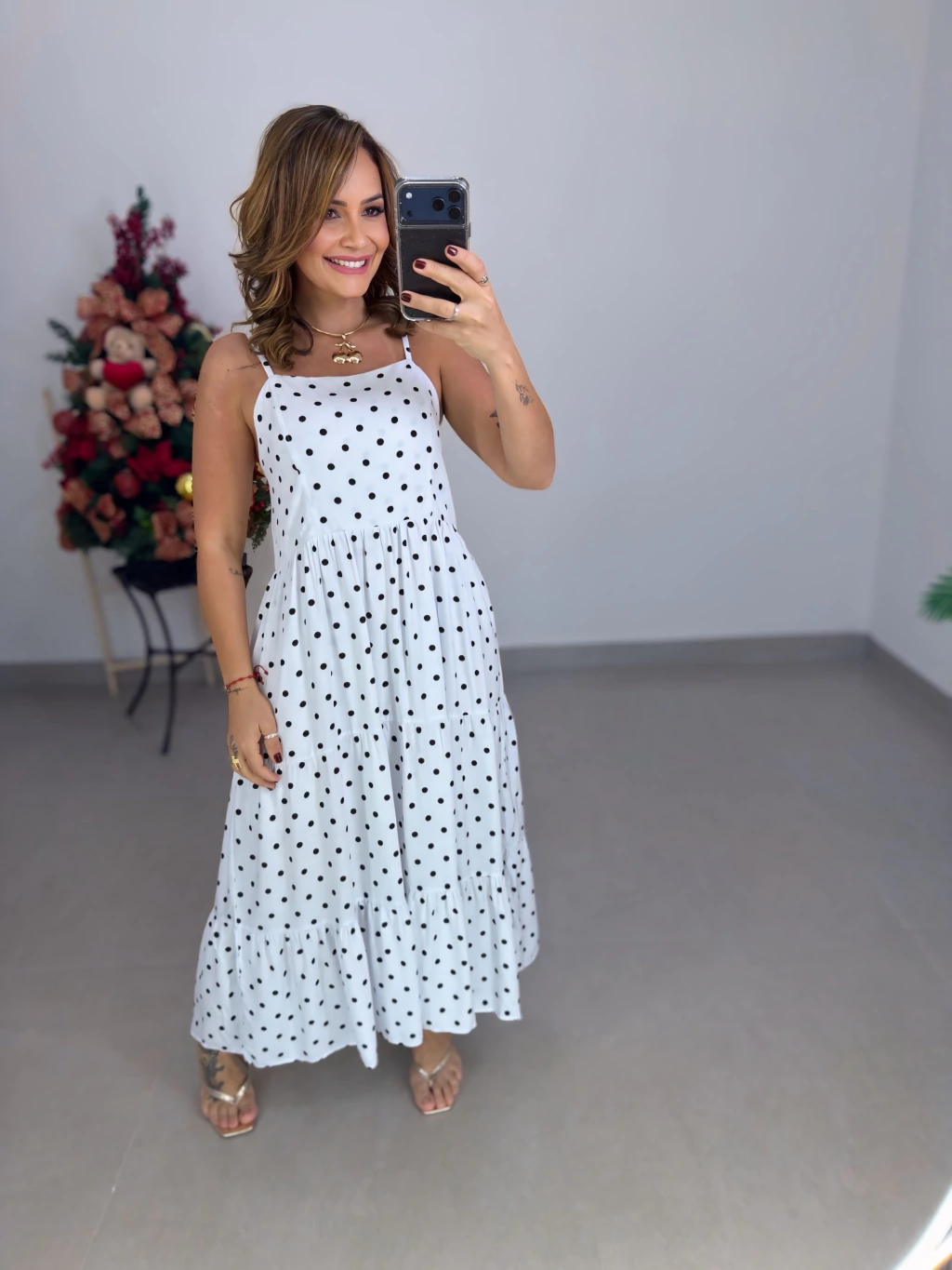 Confeccionado em tecido viscolinho leve, este vestido midi oferece conforto e frescor ideais para o clima brasileiro. Possui alças finas com regulagem para ajuste personalizado e bojo que valoriza a silhueta com elegância. A charmosa estampa poá traz um toque clássico e versátil.