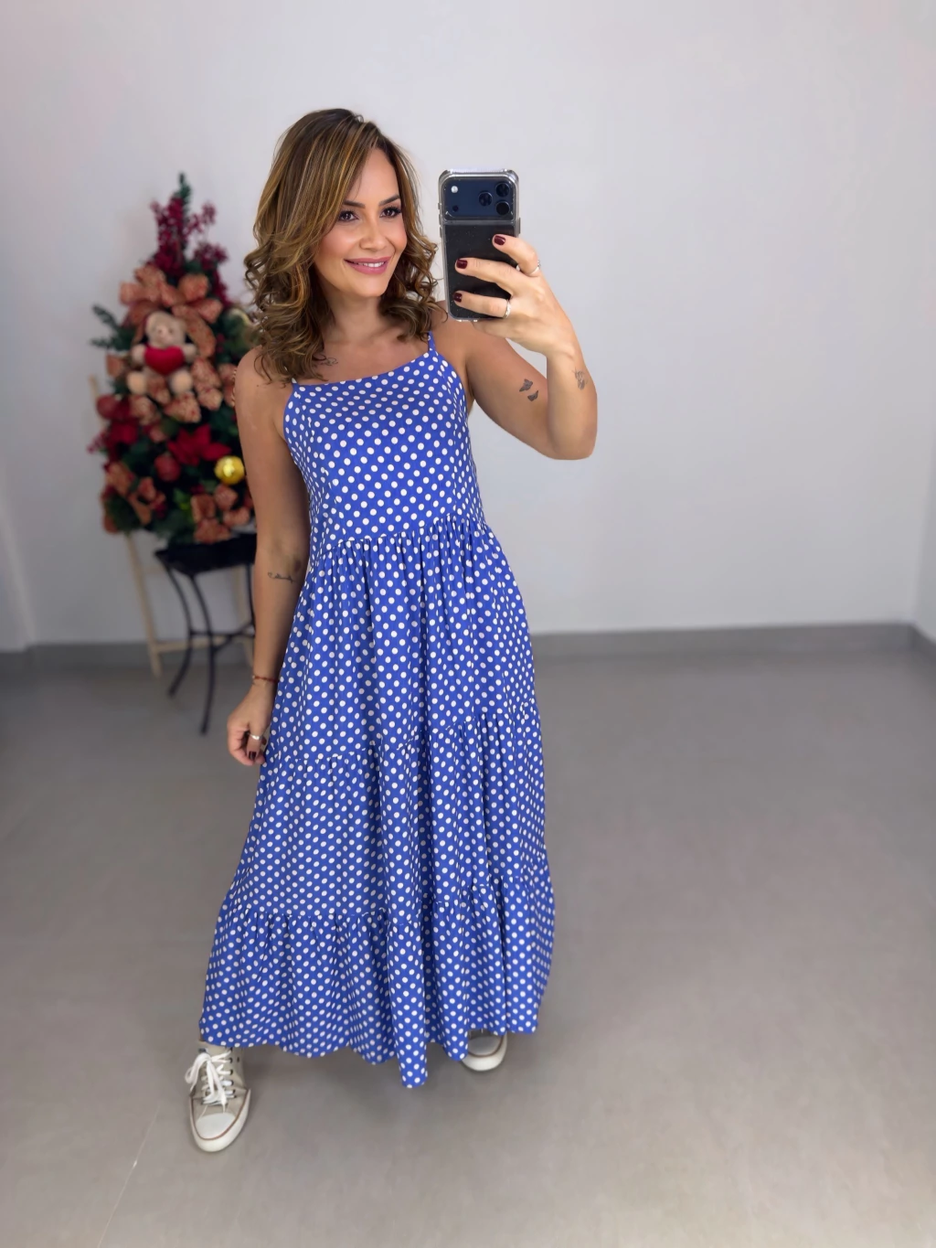 Vestido Midi Viscolinho Alça Fina com Regulagem e Bojo – Estampa Poá
